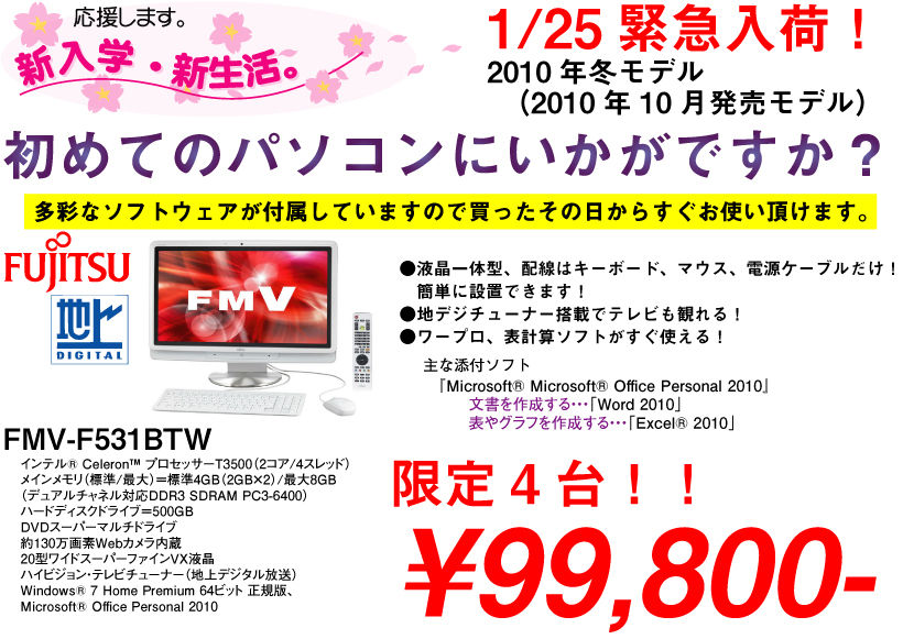 2011年01月25日 先ほどご紹介した強化ガラス製モニタースタンドに さっそく本日入荷したデスクトップパソコンを置いてみました。こんな感じになります。なかなかオシャレですねデスク周りもスッキリするし、価格も2,580円とお手頃ですのでかなりおすすめですちなみに、載っているデスクトップパソコンも、地デジチューナー搭載で、おすすめです2010年10月のモデルです。もちろん新品です。先日入荷したブラックモデルはあっという間に完売しましたので気になった方はお早めにどうぞ! < 前の記事次の記事 >