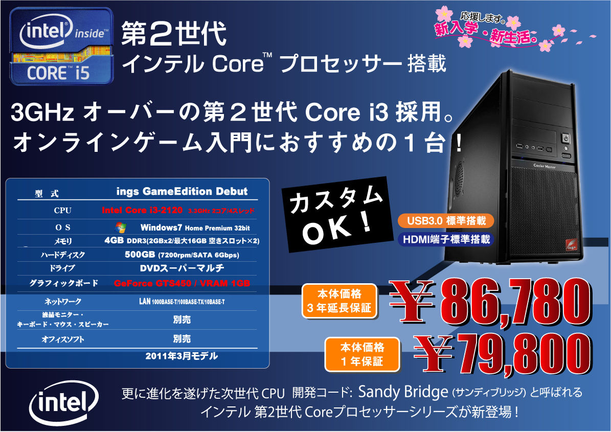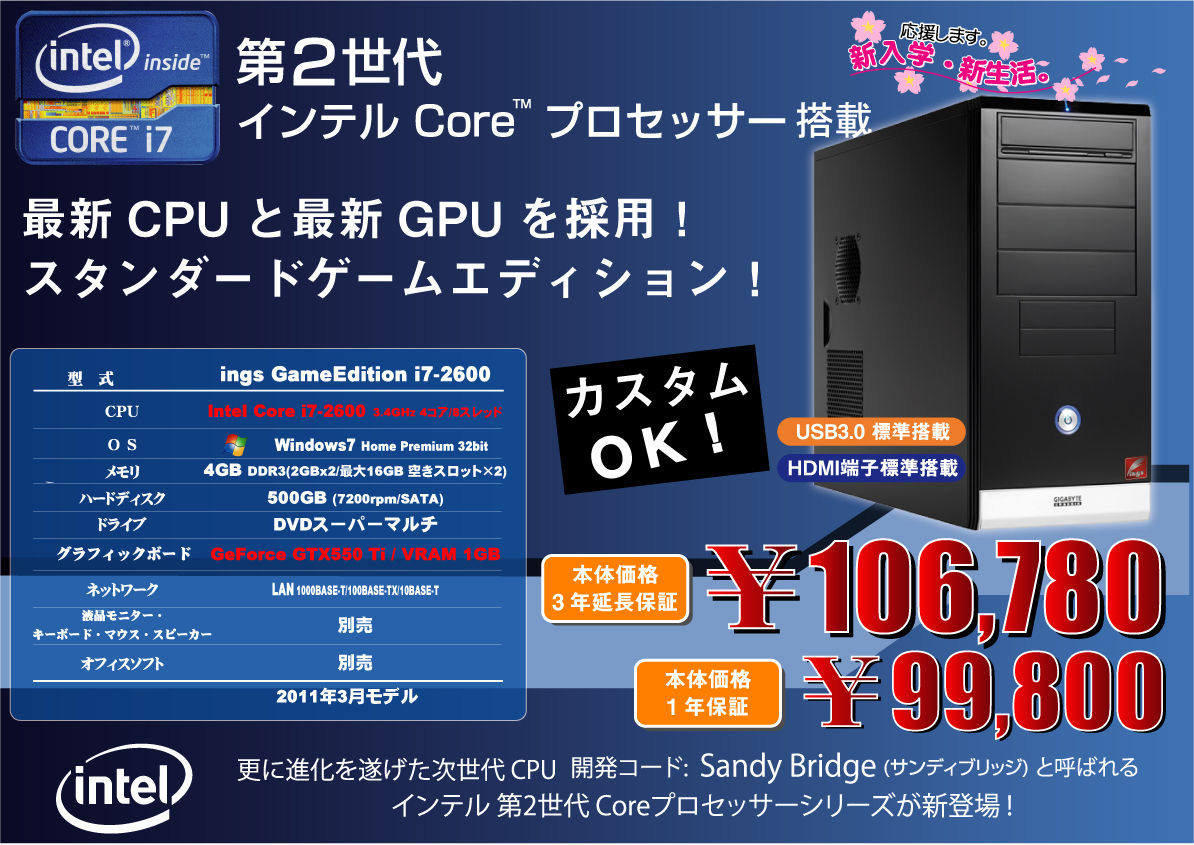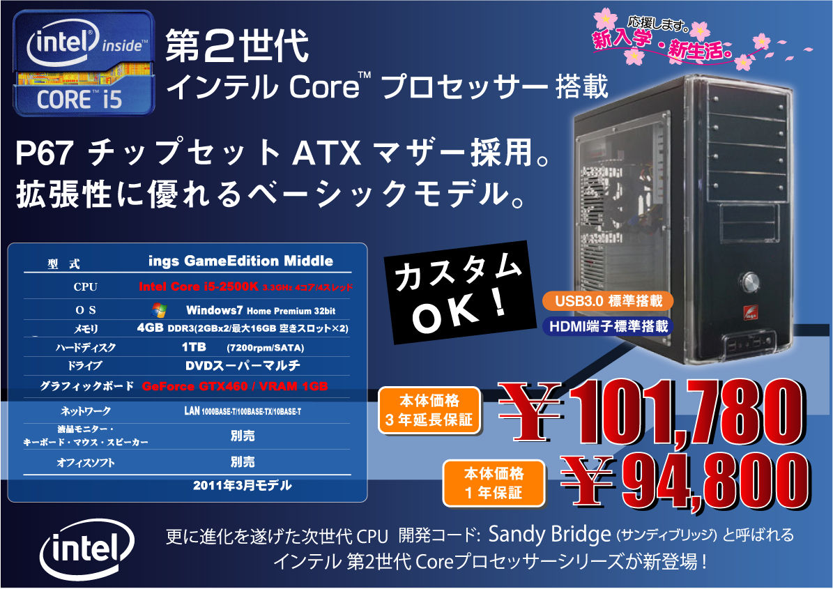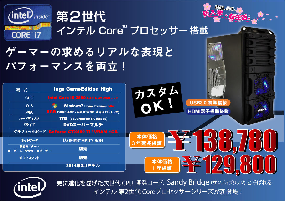 2011年03月31日 SandyBridge搭載、ings春モデル出荷開始しました。 全4機種、店頭展示しています。仕様変更も承り可能です。上記モデルはご予約受付中です。納期:2日~4日上記、在庫ございます。お持ち帰り可能です。上記モデルはご予約受付中です。納期:2日~4日上記、在庫ございます。お持ち帰り可能です。 < 前の記事次の記事 >
