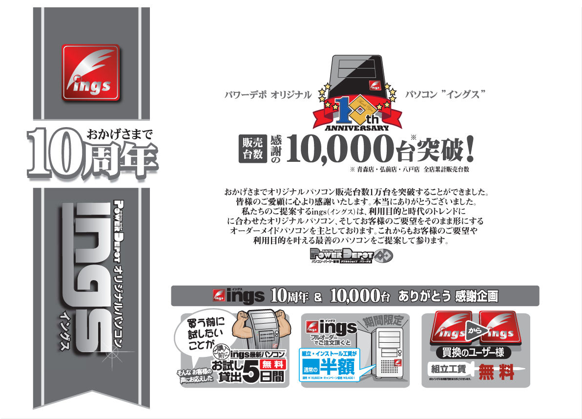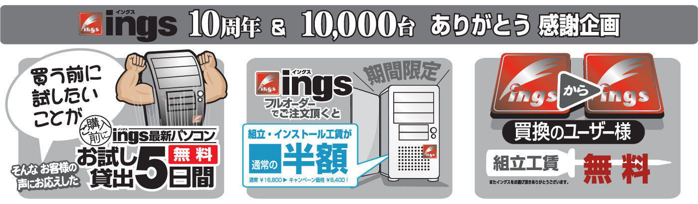 2012年06月15日 おかげさまでイングス10周年!累計10,000台突破しました! タイトルの通り、おかげさまでオリジナルパソコン販売台数10,000台を突破することができました!皆様のご愛顧に心より感謝いたします!本日より、6月末日までの期間限定で、3店合同!「ings 10周年&10,000台 ありがとう感謝企画」と題し、下記特典をご用意いたしました!ぜひこの機会をご利用ください! < 前の記事次の記事 >