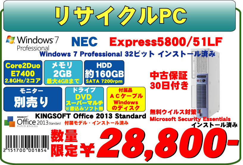付属品:Windows7インストールディスク(32bit/64bit)・ACケーブル