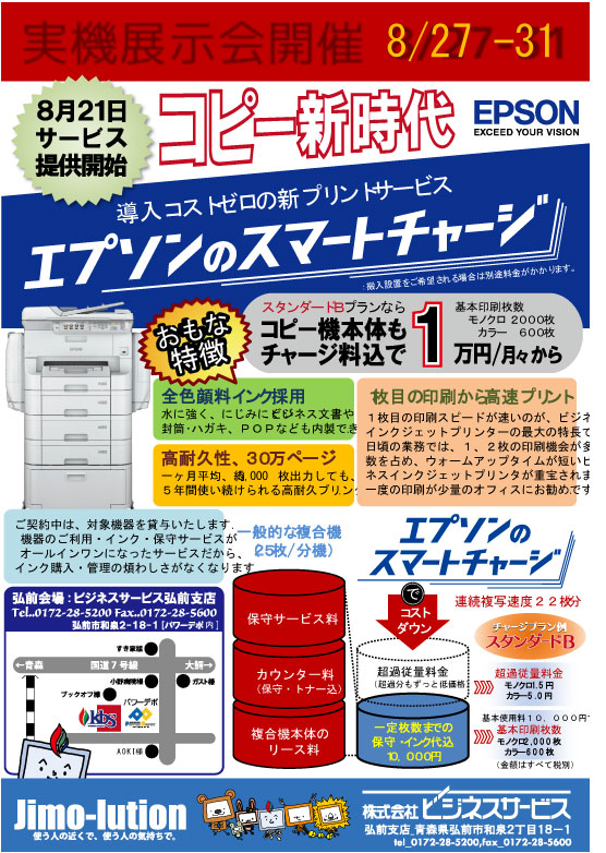 2014年08月27日 今日から開催 スマートチャージ展示会 本日 8月27日から8月31日までCMで話題のEPSON スマートチャージ 展示会を開催致します。法人のお客様ぜひ一度実機を見に来て見ませんか?実際に印刷致しますので、印字やスピードを体感できます。8月28日には、EPSON担当者が実際に説明会を行いますのでご来店お待ちしております。 < 前の記事次の記事 >