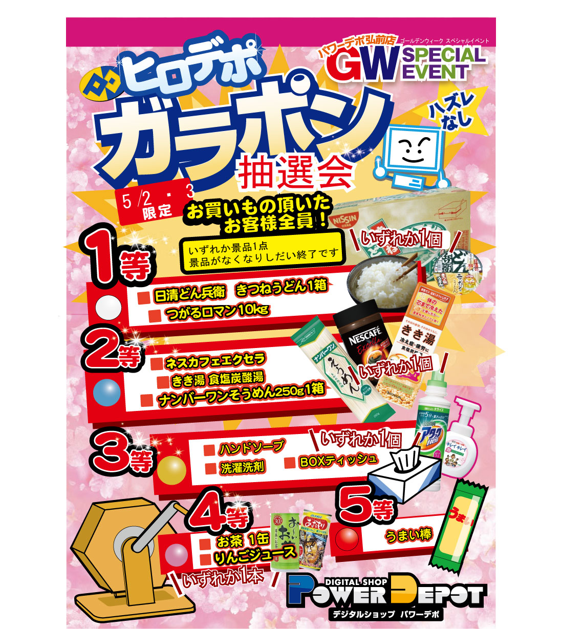 5月2日・3日イベント お買い物頂いたお客様全員対象 ガラポン抽選会!