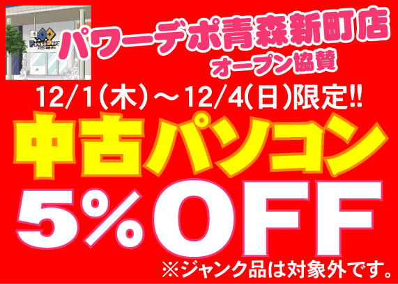 2016年12月01日 新町店オープン協賛 12月1日(木)より「パワーデポ青森新町店」がオープンいたします!!ブログも掲載中http://shinmachi.depolog.com/弘前店も協賛として、いつもは土・日・祝などですが12月1日(木)~12月4日(日)まで中古PC 5%OFFセールを行います!!"1品もの"の中古品もございます。お早めに!! < 前の記事次の記事 >
