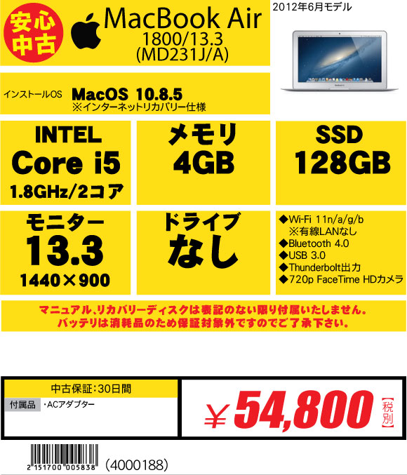 2017年04月06日 しばらくぶりのMac 中古ノートパソコンMacBook Air (MD231J/A)¥54,800-(税抜)■MacOS 10.8.5 ※インターネットリカバリー仕様■13.3インチ 1440×900■CPU:Core i5 (1.8GHz/2コア)■メモリ:4GB ■SSD:128GB※光学ドライブなし■Wi-Fi ■Bluetooth4.0しばらくぶりに入荷しております中古でも人気が根強いのはさすがMacというところでしょうか。こちらももちろん1品限り次回の入荷もさっぱりわかりませんので気になったらお早めに < 前の記事次の記事 >