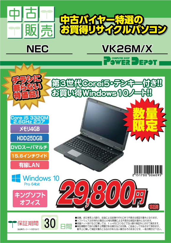 2017年06月22日 特価中古追加 弘前店限定!!特価中古です!!NEC VK26M/X¥29,800-(税抜)■Windows 10 Pro 64bit■15.6インチ 1366×768■CPU:Core i5-3320M(2.6GHz/2コア)■メモリ:4GB ■HDD:250GB■DVDスーパーマルチドライブ※再生ソフトなし■有線LAN■Kingsoft Office 付属第3世代Core i5搭載の中古ノートKingsoft Officeも付いていますよもちろん数量限定移転オープンセールは25日(日)まで開催!!場所は上記地図でご確認ください!!※特価品は数量限定のものがございます。売り切れの際はご容赦ください。 < 前の記事次の記事 >