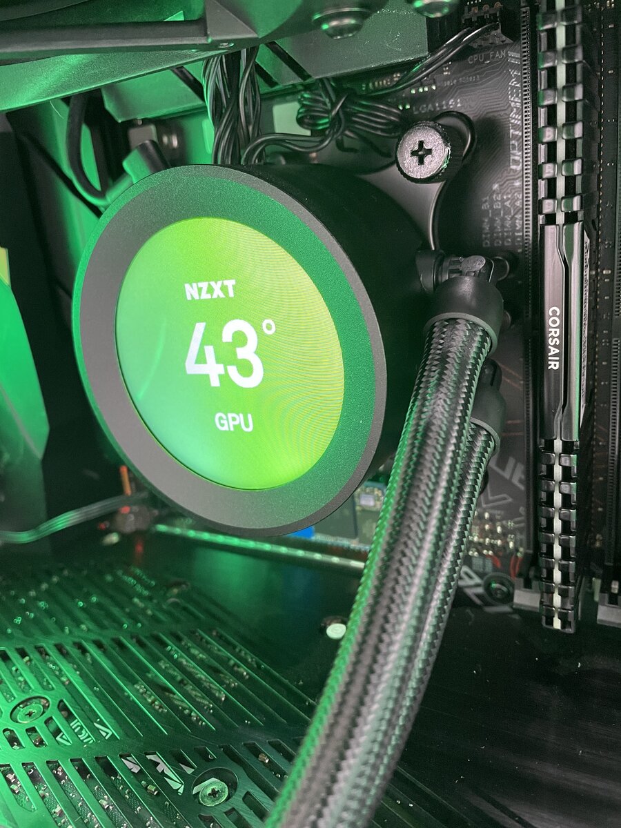 また、NZXTの簡易水冷CPUクーラー(KRAKEN Z53)を使用しており、水冷のヘッドにLCDディスプレイが搭載されています!こちらのディスプレイは、専用のNZXT CAMソフトを使用することによって、色の制御はもちろんのこと、CPUやGPU温度の表示、画像やGIFなどの設定もすることができてしまいます!