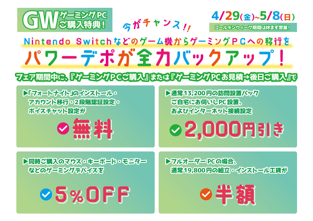 気になるゲーミングPCのスペックや価格は画像をクリックするとPDFデータでご覧いただけます。GWゲーミングPCご購入特典!