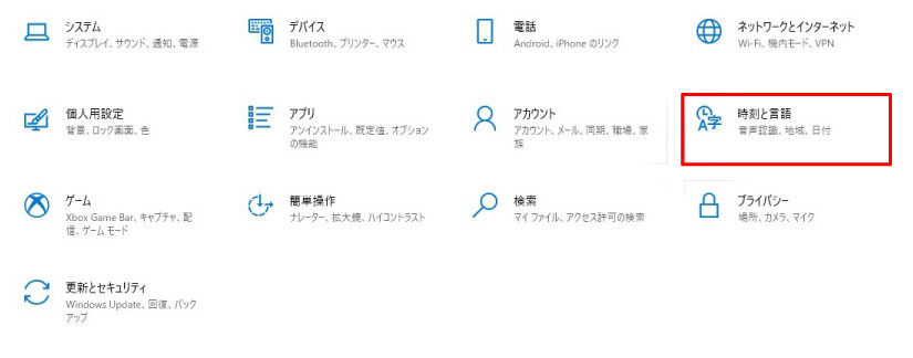 2.「設定」メニュー内の「時刻と言語」をクリックします。
