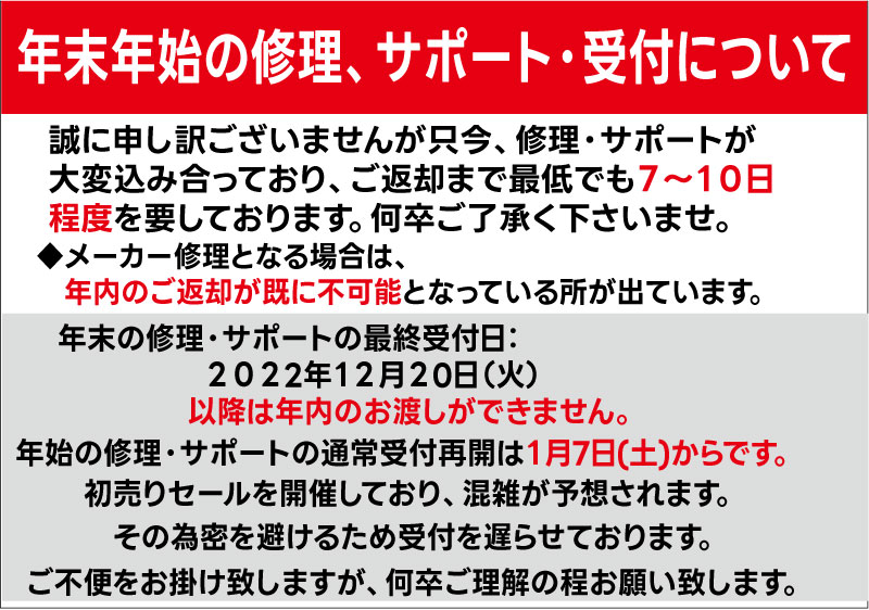 サポート・修理の持込、ご相談はお早めにお願いいたします。
