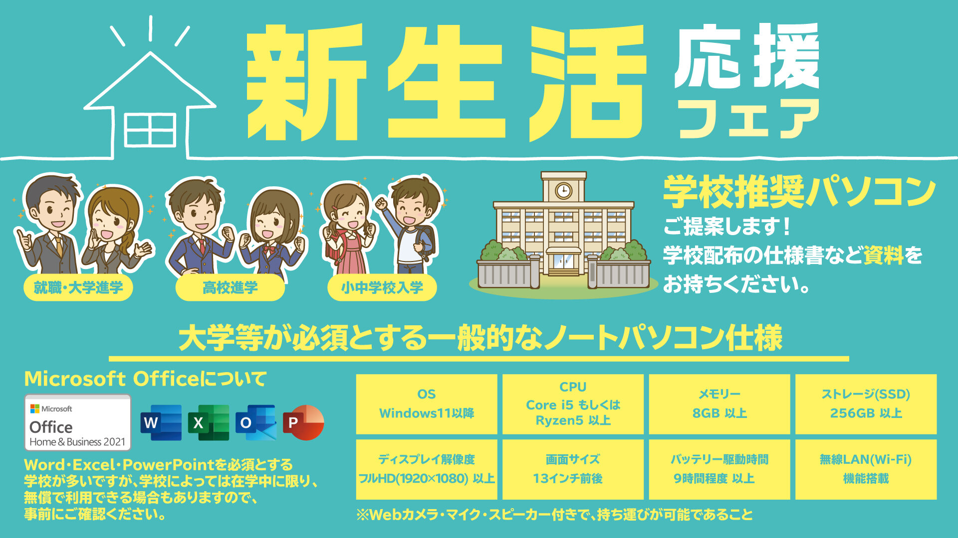 当店調べとなりますが、大学等で必要となるノートパソコンの仕様を上図まとめました。