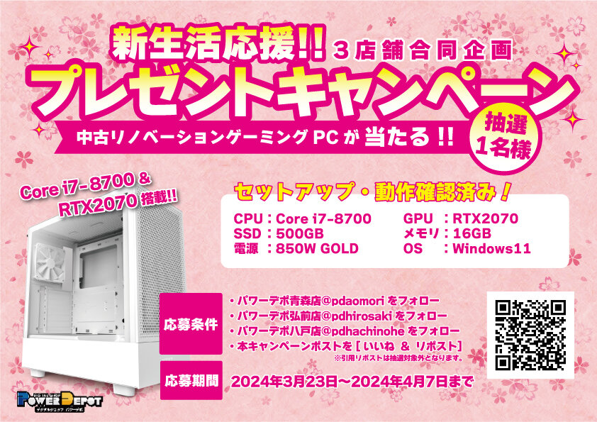 / パワーデポ3店舗合同企画 ゲーミングPCが当たる【応募方法】 ・パワーデポ青森店 をフォロー ・パワーデポ弘前店 をフォロー ・パワーデポ八戸店 をフォロー ・本キャンペーン投稿をいいね&リポスト(※引用リポストは抽選対象外) 【応募締切】 2024年4月7日(日) 19時00分まで ▼キャンペーン規約▼ http://bit.ly/4cn43Qc