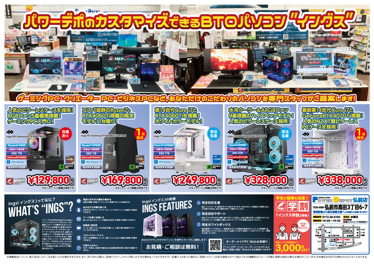 パワーデポのBTO(Build To Order)パソコン「イングス」は、パワーデポスタッフが厳選したパーツで構成された「ショップモデル」とお客様のご要望にあわせた「カスタムオーダーモデル」「フルオーダーモデル」があります。必要とする性能でパーツを自由に選べる自作パソコンのメリットはそのままに、面倒な組立、OSインストール、動作確認は全てパワーデポが行います。さらに当店で組み立てたパソコンは「ings」として1年保証が付帯しますのでご購入後も安心です。