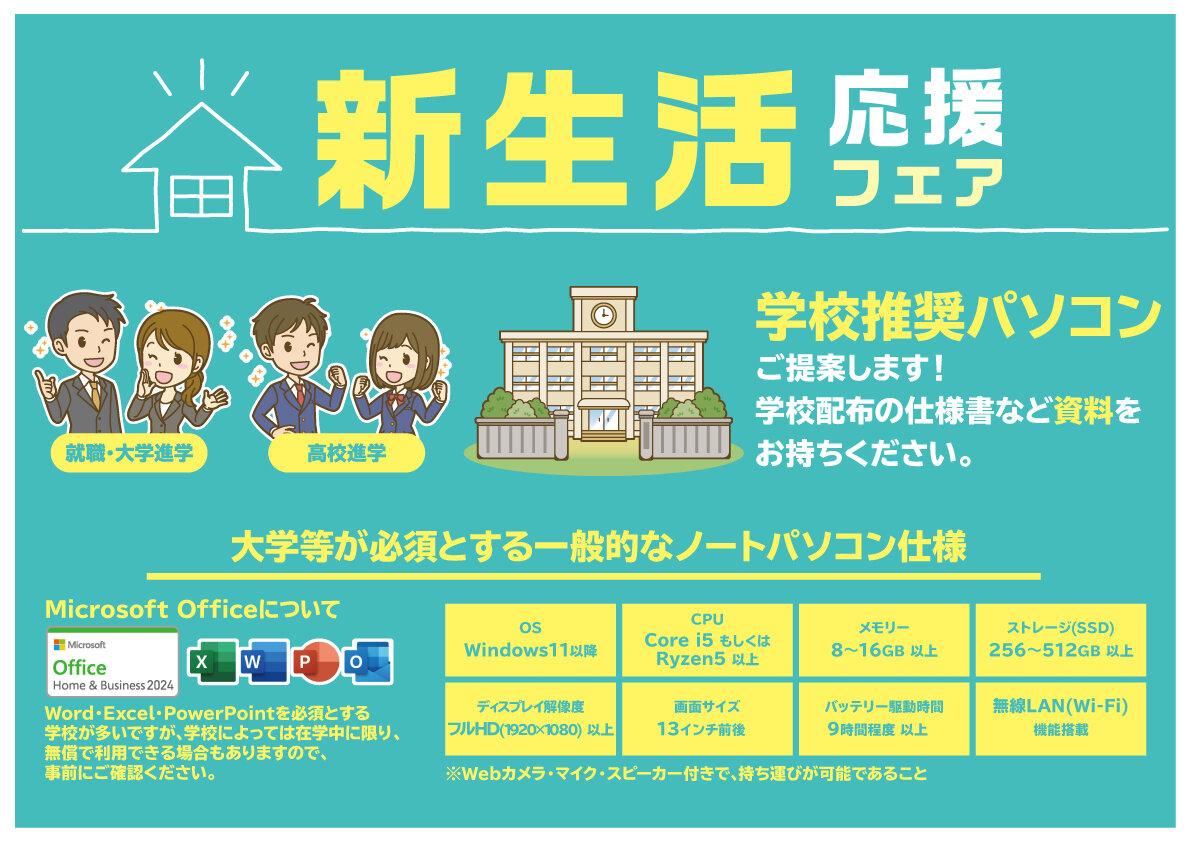 当店調べとなりますが、大学等で必要となるノートパソコンの仕様を上図にまとめました。店頭にも掲示しておりますので参考までにご覧ください。