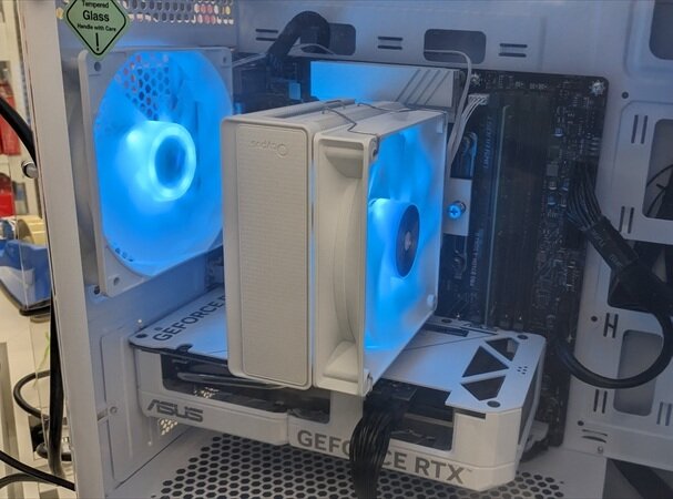 こちらのPCはケース、グラフィックボード、CPUクーラーがホワイトカラーで統一されており、CPUクーラーのファンと背面ケースファンはLED対応です。LEDは付属アプリ「MSI Center」内の「Mystic Light」にて発光パターンやカラーを変更可能になっています。